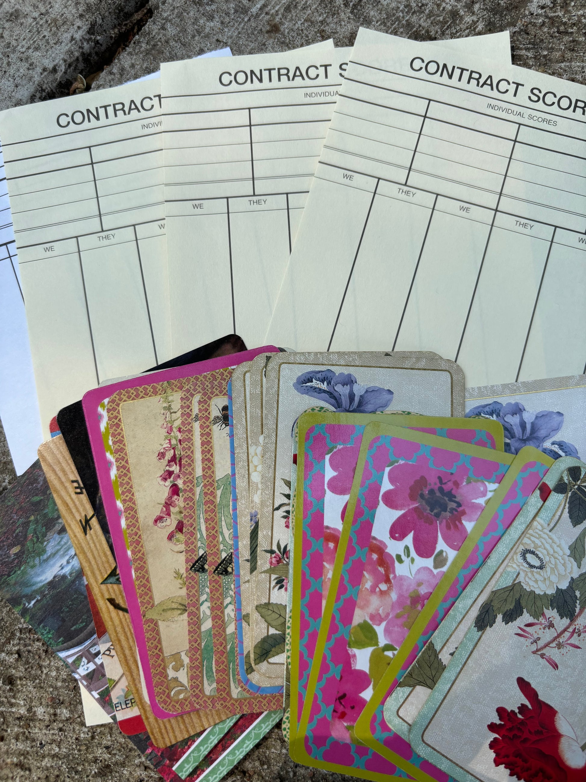 20 assorted vintage playing cards and 4 vintage bridge score pad sheets